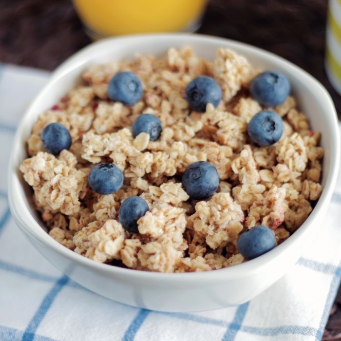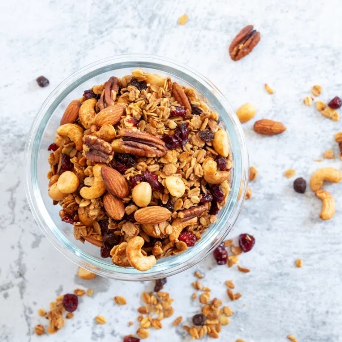 Granola là hỗn hợp gồm yến mạch, các loại hạt (hạnh nhân, óc chó, hạt điều…), trái cây khô và thường được nướng với mật ong hoặc đường. Granola cung cấp nhiều năng lượng và chất béo tốt, nhưng hàm lượng đường có thể cao ở một số loại.